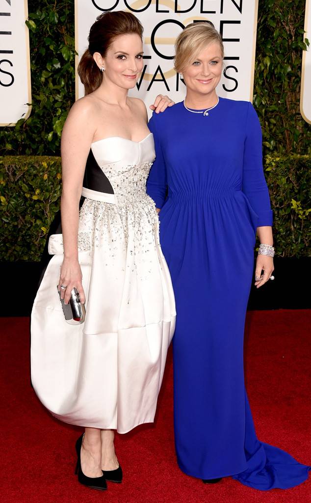 Tina Fey & Amy Poehler – Let’s face it, Tina and Amy tend to come in a package deal, so why not group this unstoppable duo together now, too? They walked the red carpet together, hosted the Golden Globes (for the last time—tear), and did it all looking fabulous. Tina, in a crisp white tea length dress with black and stitched accents. And Amy in a cobalt blue gown that definitely made her stand out.