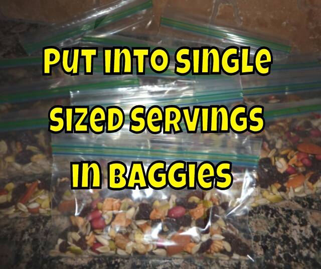 Combine all ingredients in a large bowl and mix. Separate into 1 1/2 oz servings and put into ziploc bags. Keep handy for a quick and nutritious snack.