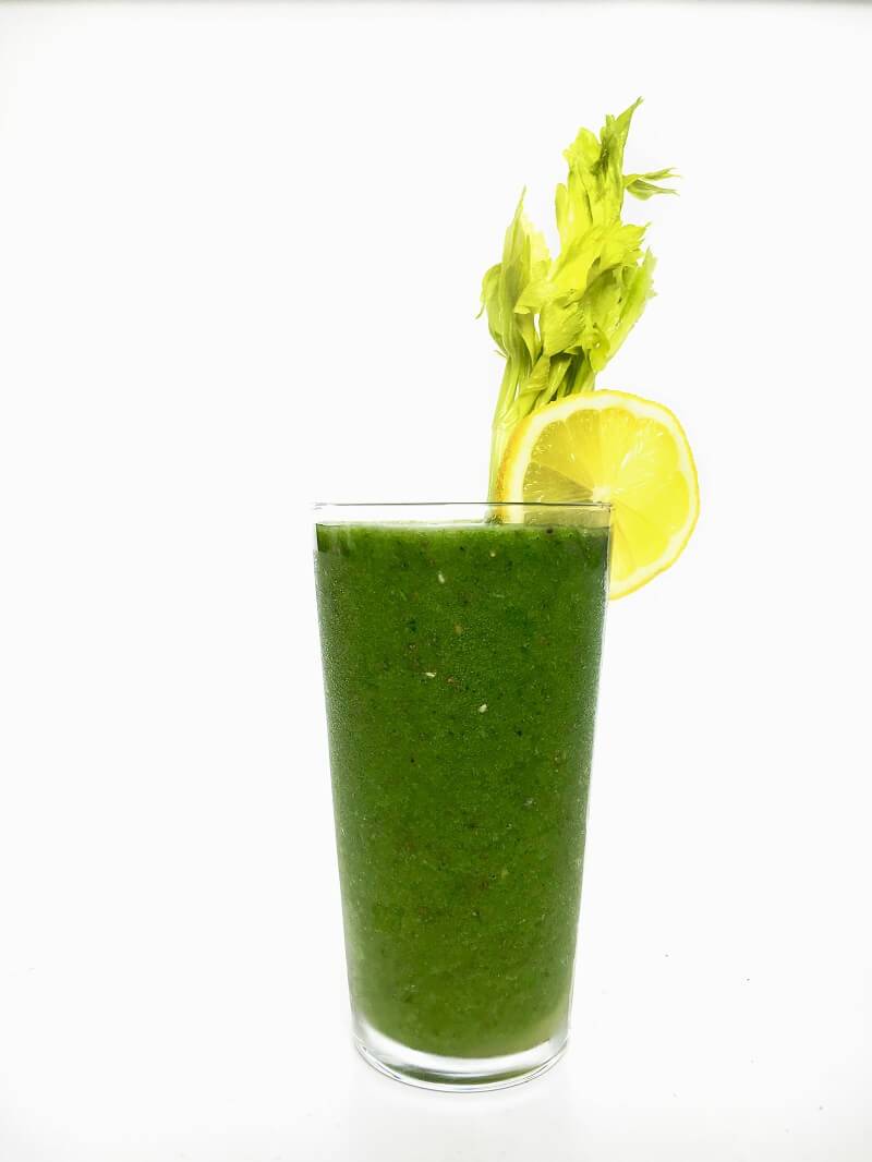In a blender, add in the kale, spinach, tomato, celery, horseradish, cayenne, and black pepper. Squeeze in juice of ½ lemon. Pour in water and 2-3 ice cubes and blend! Add more water if needed.