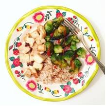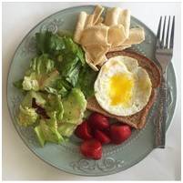 - Dinner: “Tonight I wasn’t feeling so ambitious preparation-wise, so I made eggs with toast, a side salad, some fruit and quinoa chips. I make my eggs with a little butter because just a little butter (or a little of anything, for that matter) doesn’t hurt anyone, and I love how it tastes.Otherwise my dinners are usually similar to my lunches, like whole wheat spaghetti with salmon and veggies, or healthy ‘fried’ rice, which is just brown rice, scrambled egg, and mixed vegetables, always (can you guess?) using the plate method to portion it out.”
