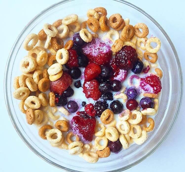 - Breakfast: “Today I had Cheerio’s (regular and multi grain) in soy milk. I love defrosting frozen berries in the fridge overnight so they’re ready to go right into my cereal the next day. It saves so much time and adds flavor, nutrients, and fiber to keep me full. I boiled an egg while I was getting ready and threw it into my lunch bag on my way out the door. I run (literally) to the train every morning, so breakfast has to be quick and easy. If it’s not a boiled egg, I’ll make an over-easy egg to eat at home. I always try to include protein with my breakfast. Research shows that having protein with breakfast helps moderate hunger throughout the day, and personally, I notice a huge difference in how soon I’m hungry again if I don’t eat that egg in the morning! It really helps keep my hunger in check so I can focus.”